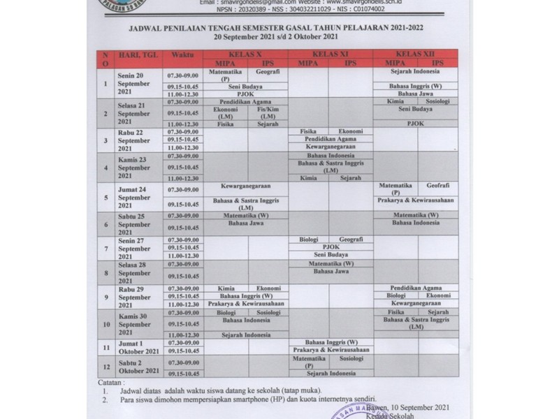Salam Videlis!SMA Virgo Fidelis akan melaksanaan Penilaian Tengah Semester Ganjil 2021/2022 mulai tanggal 20 September 2021 sampai dengan 2 Oktober 2021.Berikut jadwal pelaksanaannya,Selamat belajar. Tuhan Memberkati. ...